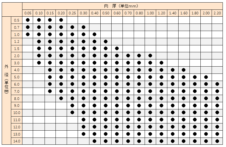 | キャピラリーチューブの製造範囲 限りなくゼロ径に近い外径のチューブまで製作可能ですが、参考サイズは下表のとおりです |
