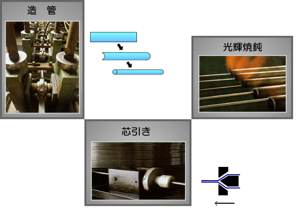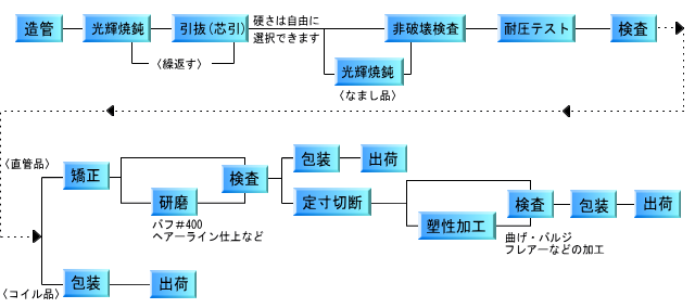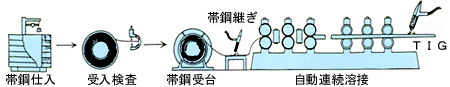 フープ材(帯鋼)を連続ロールホーミングし、継目をプラズマ・TIGを行った溶接管です。 これを、用途・ご要望に応じ固溶化熱処理(光輝焼鈍)と冷間引抜加工を繰返し行い、ご要望のサイズのパイプを製造致します。